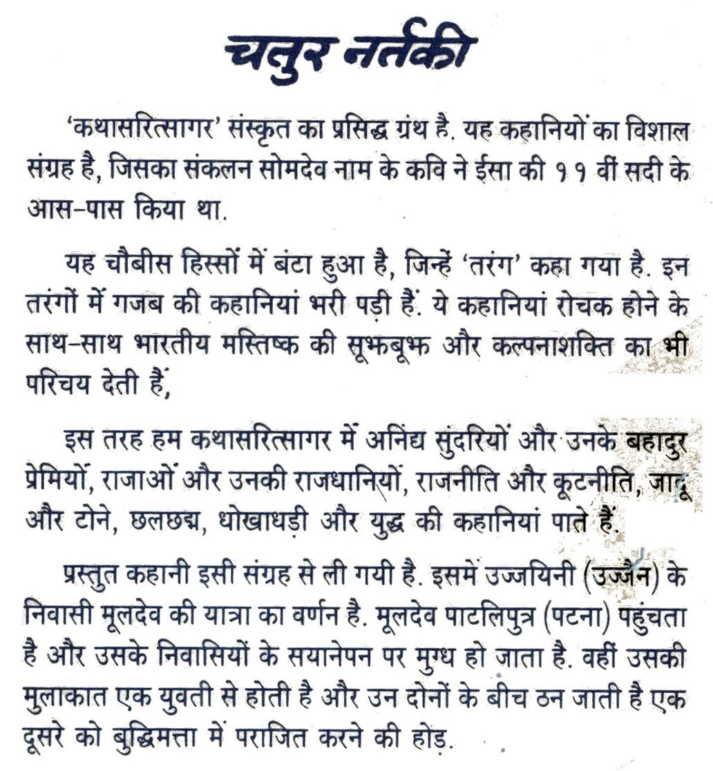 यह एक बहुत ही रोचक और बुद्धिमत्ता से भरी कहानी है। उज्जयिनी, वर्तमान में उज्जैन में मूलदेव नाम का एक बहुत विद्वान और चतुर ब्राह्मण रहता था। उसे अपनी बुद्धि पर बहुत गर्व था। एक बार वह पाटलिपुत्र, वर्तमान में पटना पहुँचा, जहाँ के लोग अपनी समझदारी के लिए जाने जाते थे। वहाँ उसकी मुलाकात देवदत्ता नाम की एक बहुत ही सुंदर और बुद्धिमान नर्तकी से हुई। देवदत्ता और मूलदेव के बीच एक-दूसरे को नीचा दिखाने या बुद्धिमत्ता में हराने की होड़ मच गई। देवदत्ता ने अपनी चतुराई से मूलदेव को कई बार मात दी। एक बार जब मूलदेव सो रहा था, तो देवदत्ता के लोग उसकी जानकारी के बिना उसके नीचे से पलंग तक उठा ले गए और उसे पता भी नहीं चला। सुबह उठने पर मूलदेव को अपनी इस हार पर बहुत लज्जा महसूस हुई। आगे की कहानी के लिए यह कॉमिक्स पढ़ें........!