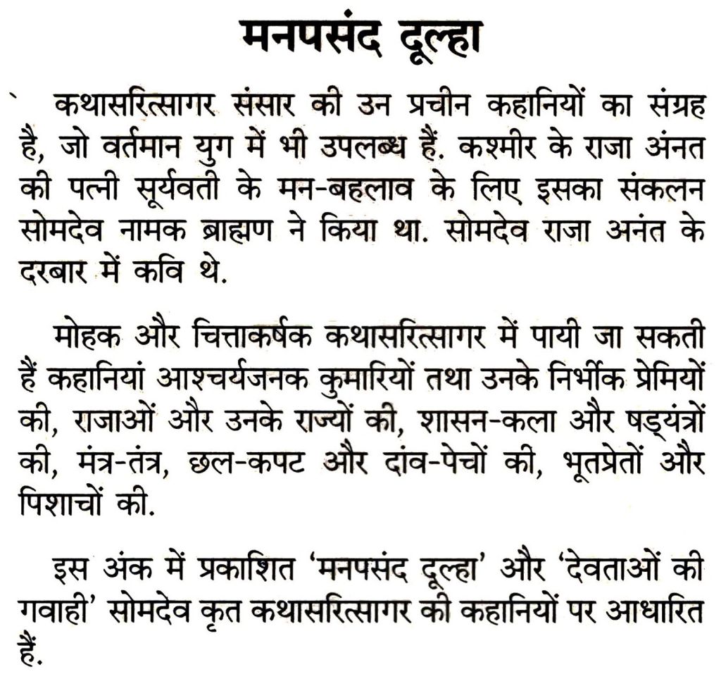 कथासरित्सागर संसार की उन प्राचीन कहानियों का संग्रह है, जो वर्तमान युग में भी उपलब्ध हैं। कश्मीर के राजा अनंत की पत्नी सूर्यवती के मन-बहलाव के लिए इसका संकलन सोमदेव नामक ब्राह्मण ने किया था। सोमदेव राजा अनंत के दरबार में कवि थे। मोहक और चित्ताकर्षक कथासरित्सागर में आश्चर्यजनक कुमारियों तथा उनके निर्भीक प्रेमियों की, राजाओं और उनके राज्यों की, शासन-कला और षड्यंत्रों की, मंत्र-तंत्र, छल-कपट और दांव-पेचों की, भूतप्रेतों और पिशाचों की कहानियां पायी जाती हैं। इस अंक में प्रकाशित 'मनपसंद दूल्हा' और 'देवताओं की गवाही' सोमदेव कृत कथासरित्सागर की कहानियों पर आधारित हैं।