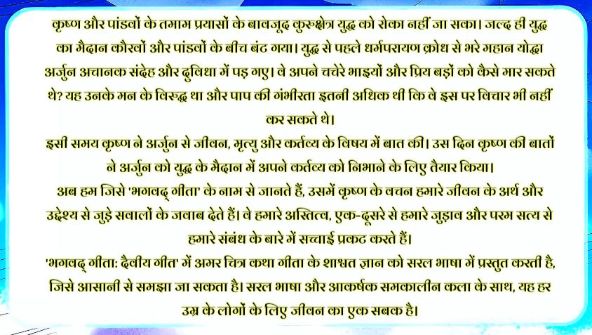 'महाकाव्य और धार्मिक कथाओं की श्रृंखला में अमर चित्र कथा द्वारा प्रकाशित कॉमिक्स, अमर चित्र कथा वह प्रकाशन है, जो पौराणिक और सांस्कृतिक उत्कृष्टों को आम लोगों के लिए सुलभ बनाने के लिए जानी जाती है। यह संस्करण परंपरा और स्पष्टता का सुंदर मेल है, जो गीता की शिक्षाओं को आधुनिक जीवन के लिए प्रासंगिक बनाता है।