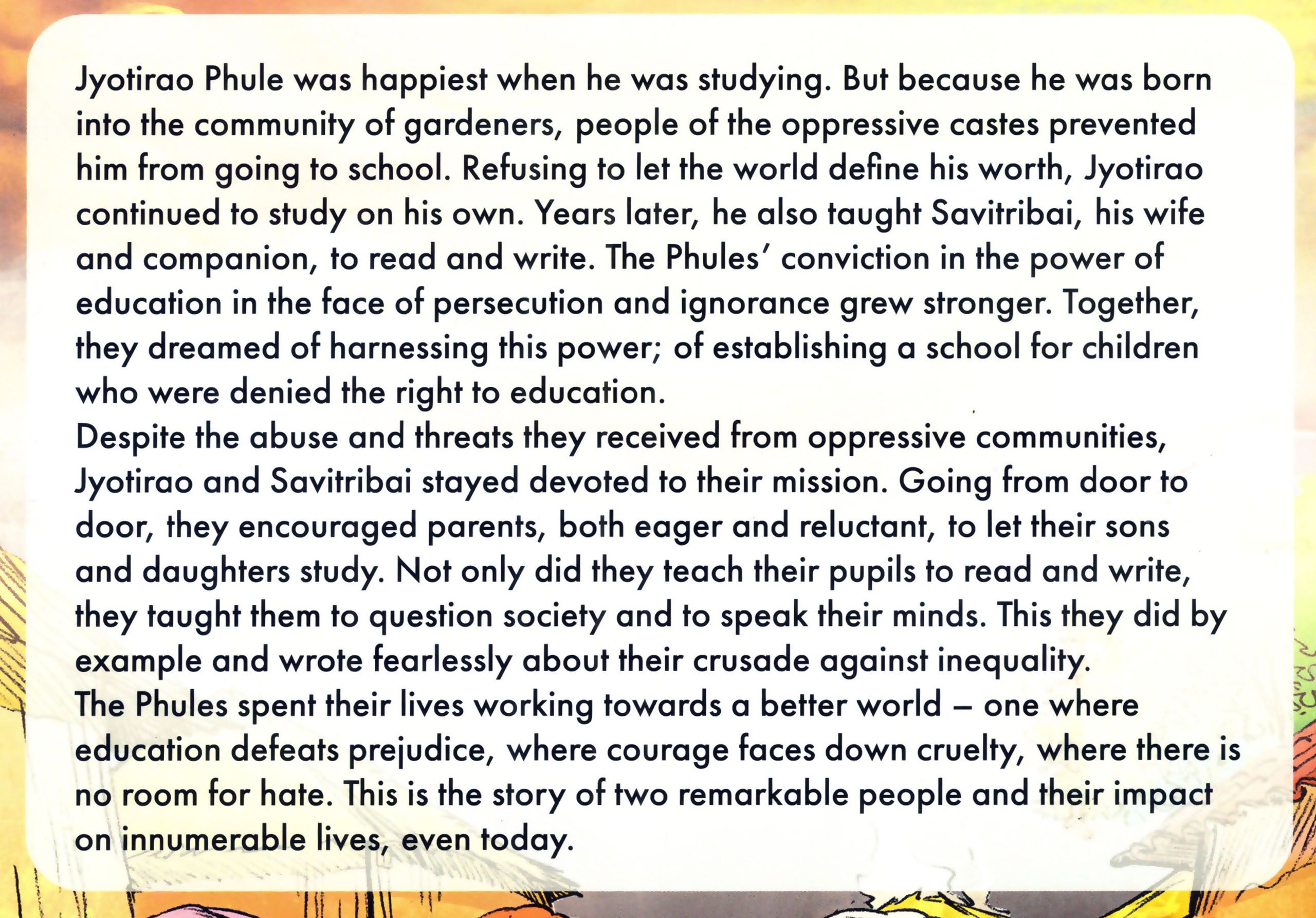 The Phules' conviction in the power of education in the face of persecution and ignorance grew stronger. Together, they dreamed of harnessing this power; of establishing a school for children who were denied the right to education. The Phules spent their lives working towards a better world - one where education defeats prejudice, where courage faces down cruelty, where there is no room for hate. This is the story of two remarkable people and their impact on innumerable lives, even today.