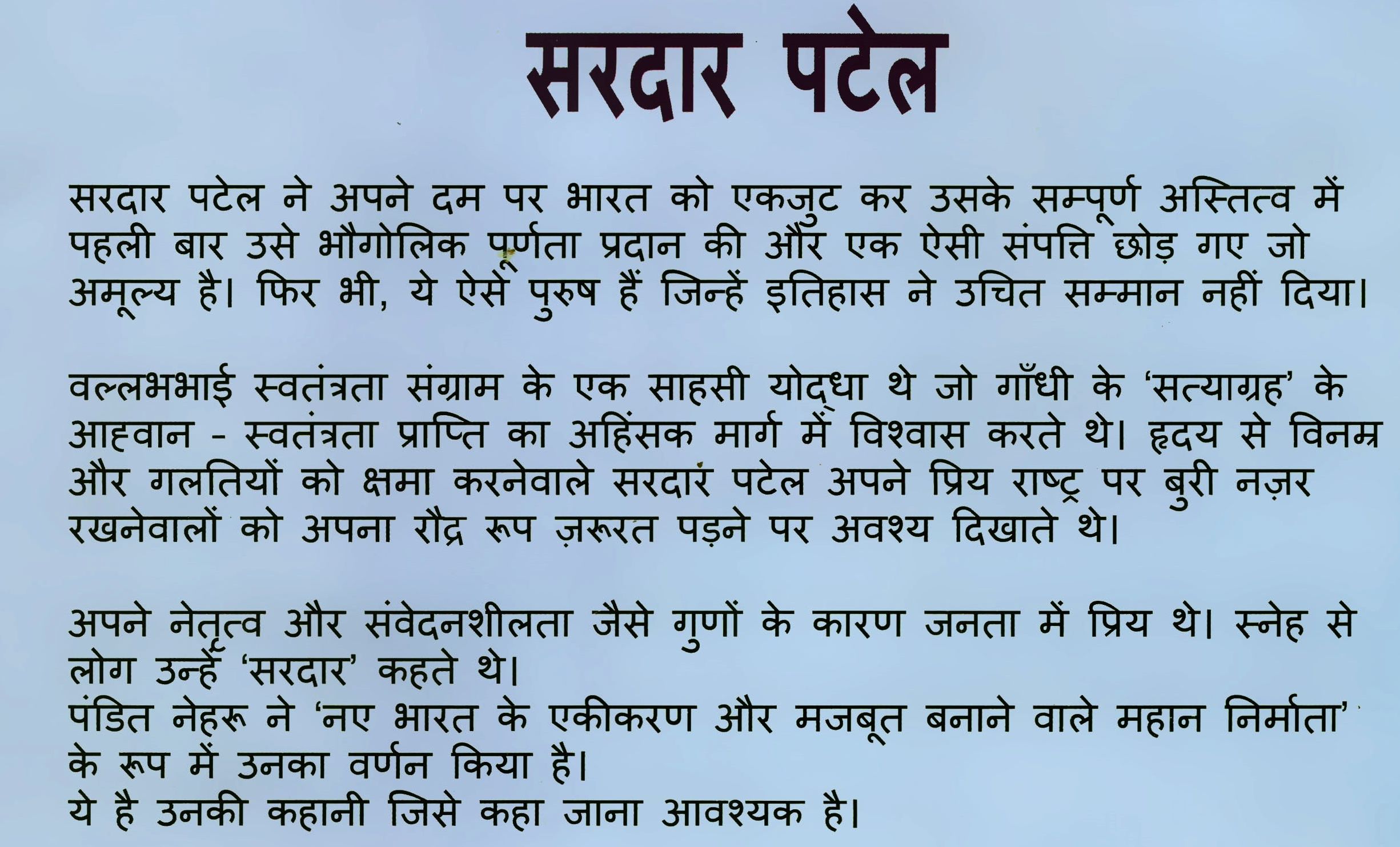 वे सख्त लेकिन न्यायप्रिय नेता के तौर पर जाने जाते थे अपने जीवन के अंतिम दिनों तक सरदार पटेल देश की सेवा में लगे रहे। उन्होंने लोगों को एकता, साहस और कर्तव्य का पाठ पढ़ाया। उनका जीवन हमें यह सिखाता है कि—अगर इरादे मजबूत हों, तो कोई भी मुश्किल बड़ी नहीं होती। सरदार पटेल की कहानी केवल एक व्यक्ति की नहीं, बल्कि पूरे भारत की कहानी है—एक ऐसे नेता की जिसने बिखरे हुए देश को एक मजबूत राष्ट्र बनाया।