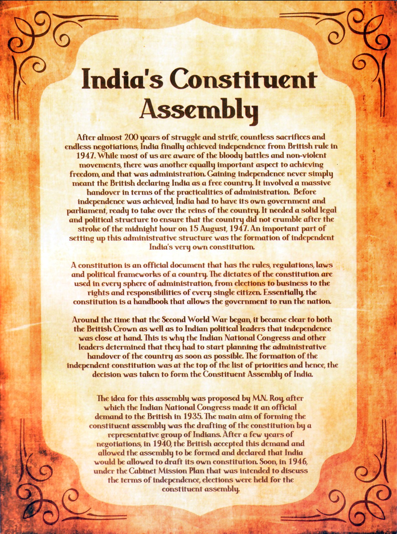 The idea for this assembly was proposed by M.N. Roy after which the Indian National Congress made it an official demand to the British in 1935. The main aim of forming the constituent assembly was the drafting of the constitution by a representative group of Indians. After a few years of negotiations, in 1940, the British accepted this demand and allowed the assembly to be formed and declared that India would be allowed to draft its own constitution. Soon, in 1946, under the Cabinet Mission Plan that was intended to discuss the terms of independence, elections were held for the constituent assembly.