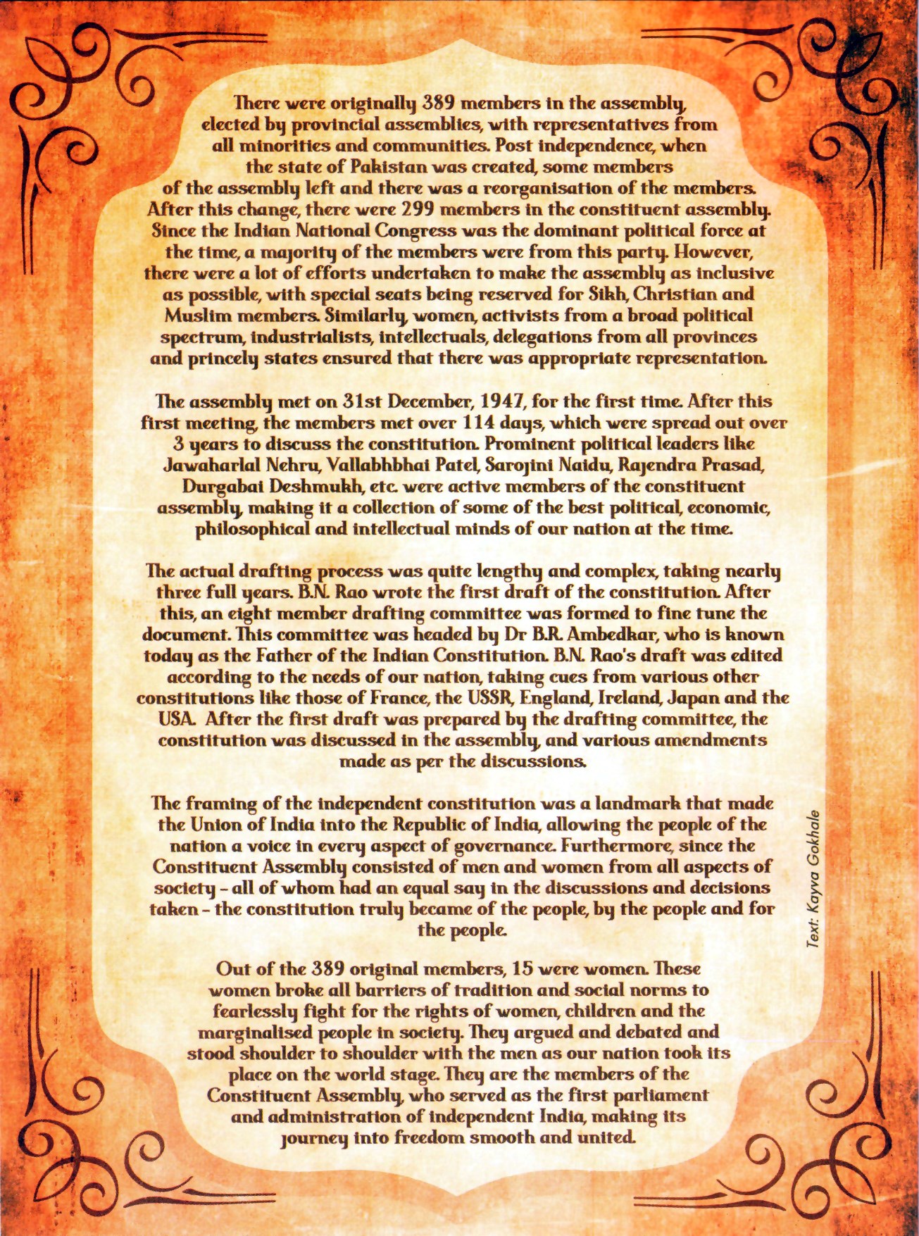 The framing of the independent constitution was a landmark that made the Union of India into the Republic of India, allowing the people of the nation a voice in every aspect of governance. Furthermore, since the Constituent Assembly consisted of men and women from all aspects of society - all of whom had an equal say in the discussions and decisions taken- the constitution truly became of the people, by the people and for the people.