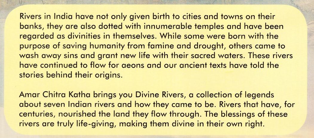Rivers in India have not only given birth to cities and towns on their banks, they are also dotted with innumerable temples and have been regarded as divinities in themselves. While some were born with the purpose of saving humanity from famine and drought, others came to wash away sins and grant new life with their sacred waters. These rivers have continued to flow for aeons and our ancient texts have told the stories behind their origins. Amar Chitra Katha brings you Divine Rivers, a collection of legends about seven Indian rivers and how they came to be. Rivers that have, for centuries, nourished the land they flow through. The blessings of these rivers are truly life-giving, making them divine in their own right.
