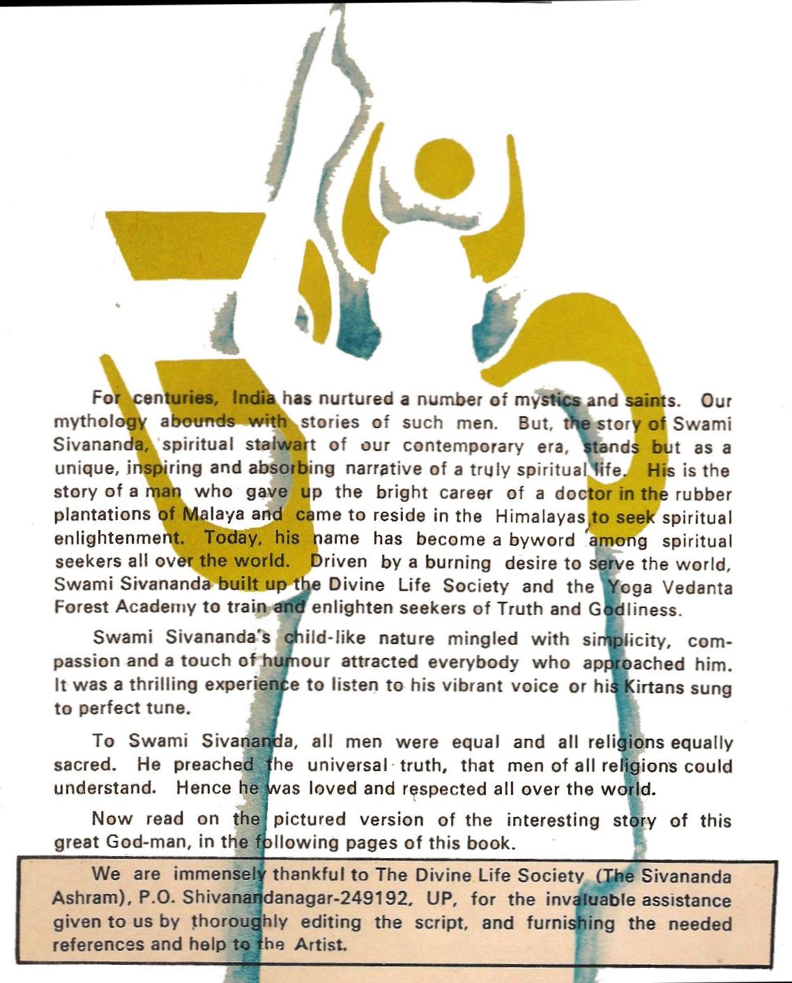 For centuries, India has nurtured a number of mystics and saints. Our mythology abounds with stories of such men. But, the story of Swami Sivananda, spiritual stalwart of our contemporary era, stands but as a unique, inspiring and absorbing narrative of a truly spiritual life. His is the story of a man who gave up the bright career of a doctor in the rubber plantations of Malaya and came to reside in the Himalayas to seek spiritual enlightenment. Today, his name has become a byword among spiritual seekers all over the world. Driven by a burning desire to serve the world, Swami Sivananda built up the Divine Life Society and the Yoga Vedanta Forest Academy to train and enlighten seekers of Truth and Godliness. Swami Sivananda's child-like nature mingled with simplicity, com- passion and a touch of humour attracted everybody who approached him. It was a thrilling experience to listen to his vibrant voice or his Kirtans sung to perfect tune.