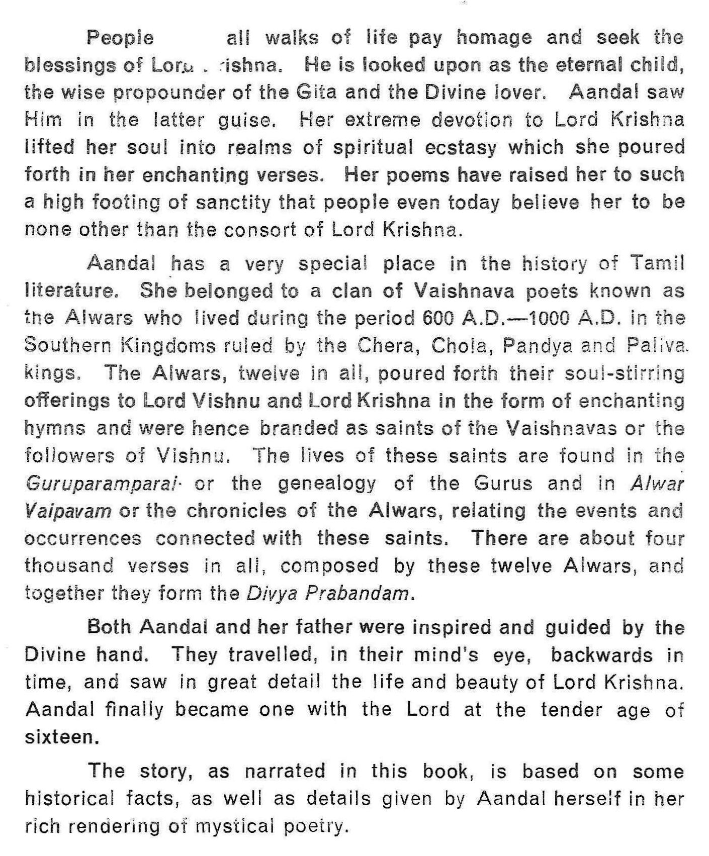 People all walks of life pay homage and seek the blessings of Loru. rishna. He is looked upon as the eternal child, the wise propounder of the Gita and the Divine lover. Aandal saw Him in the latter guise. Her extreme devotion to Lord Krishna lifted her soul into realms of spiritual ecstasy which she poured forth in her enchanting verses. Her poems have raised her to such a high footing of sanctity that people even today believe her to be none other than the consort of Lord Krishna. Aandal has a very special place in the history of Tamil literature. She belonged to a clan of Vaishnava poets known as the Alwars who lived during the period 600 A.D.-1000 A.D. in the Southern Kingdoms ruled by the Chera, Chola, Pandya and Paliva. kings. The Alwars, twelve in all, poured forth their soul-stirring offerings to Lord Vishnu and Lord Krishna in the form of enchanting hymns and were hence branded as saints of the Vaishnavas or the followers of Vishnu. The lives of these saints are found in the Guruparamparai or the genealogy of the Gurus and in Alwar Vaipavam or the chronicles of the Alwars, relating the events and occurrences connected with these saints. There are about four thousand verses in all, composed by these twelve Alwars, and together they form the Divya Prabandam. Both Aandal and her father were inspired and guided by the Divine hand. They travelled, in their mind's eye, backwards in time, and saw in great detail the life and beauty of Lord Krishna. Aandal finally became one with the Lord at the tender age of sixteen.