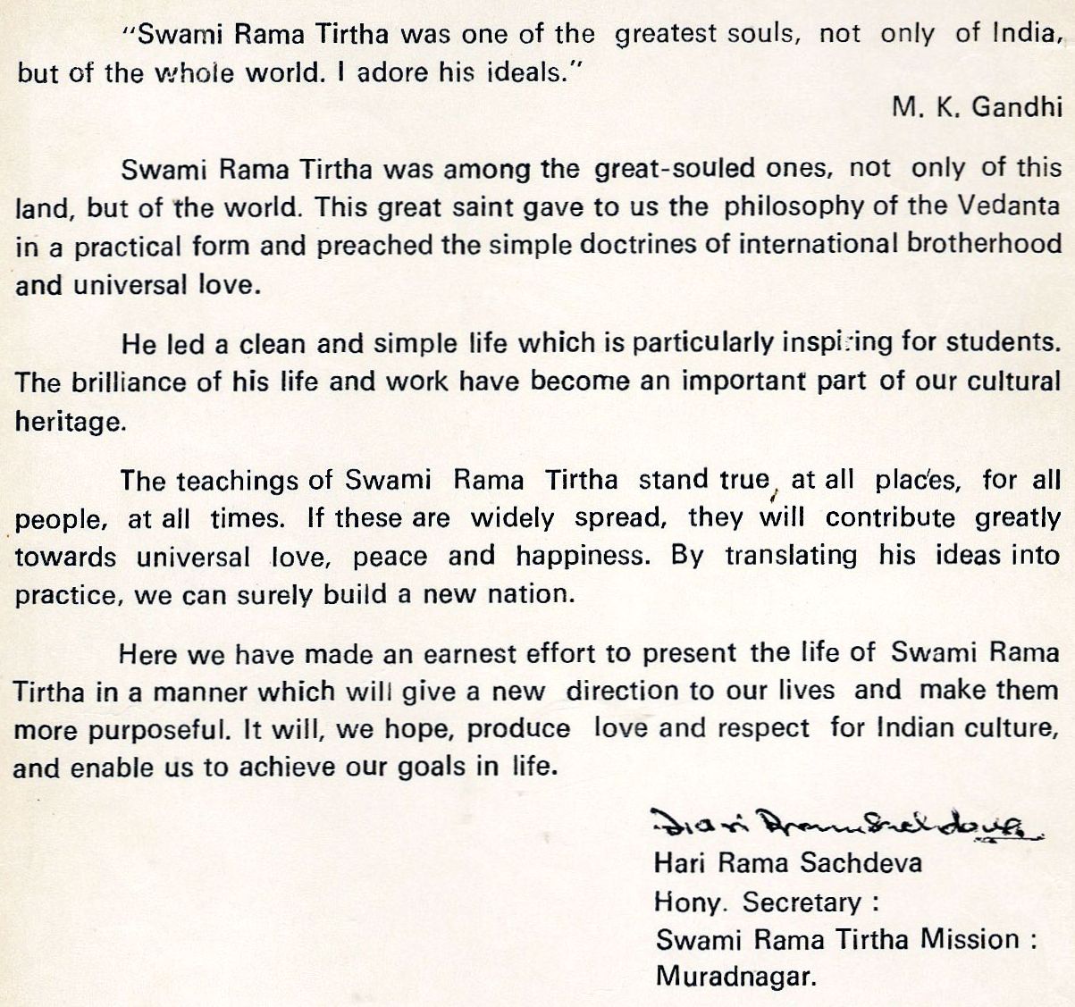 "Swami Rama Tirtha was one of the greatest souls, not only of India, but of the whole world. I adore his ideals." : M. K. Gandhi