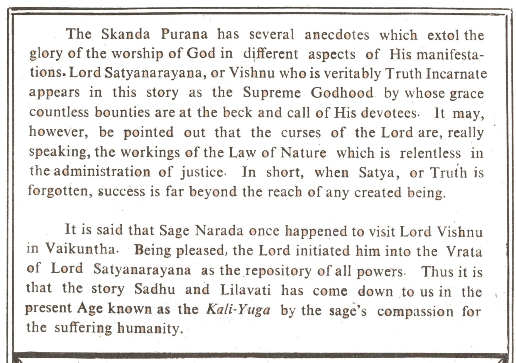 It is said that Sage Narada once happened to visit Lord Vishnu in Vaikuntha. Being pleased, the Lord initiated him into the Vrata of Lord Satyanarayana as the repository of all powers. Thus it is that the story Sadhu and Lilavati has come down to us in the present Age known as the Kali-Yuga by the sage's compassion for the suffering humanity.