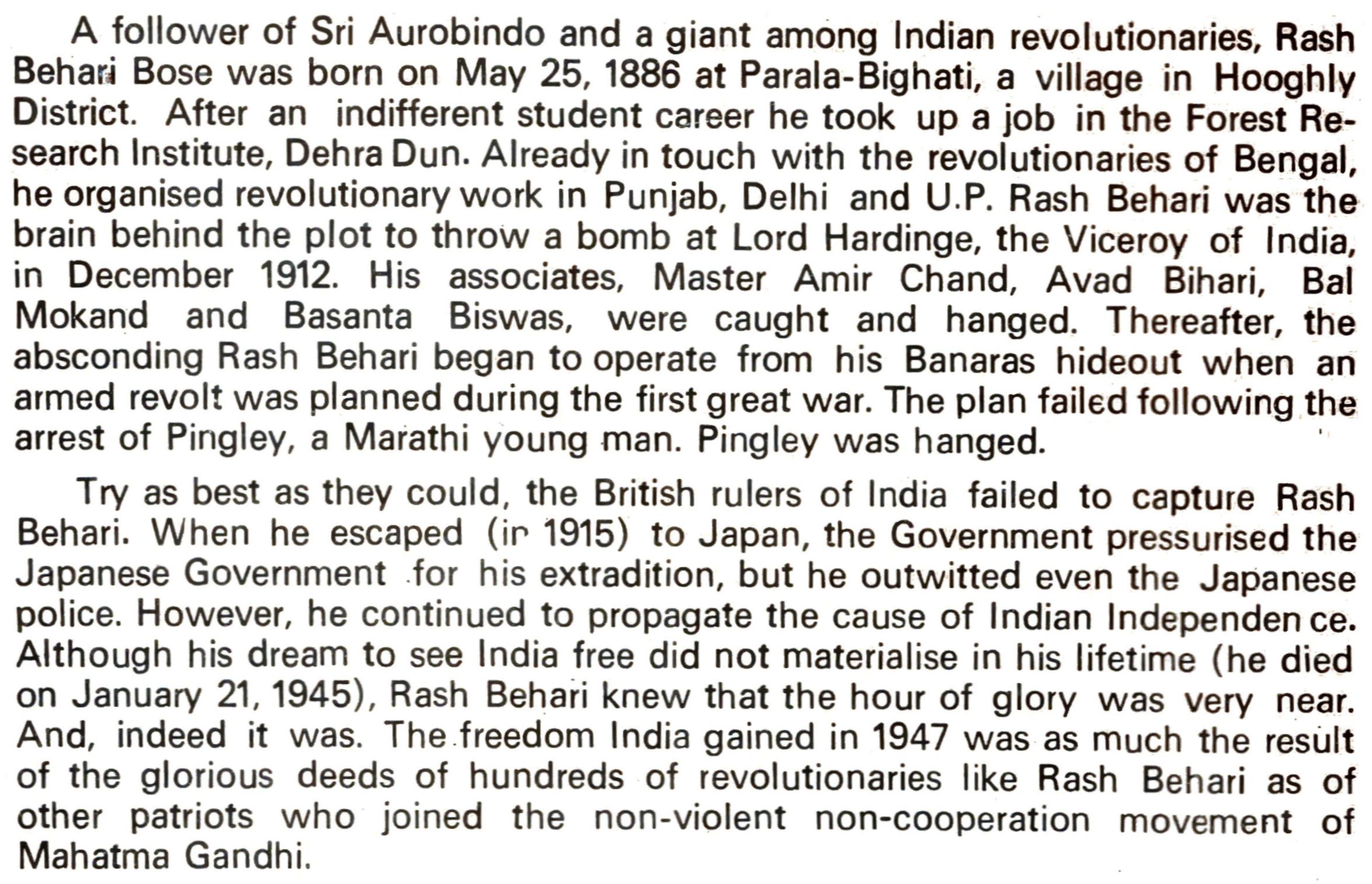A follower of Sri Aurobindo and a giant among Indian revolutionaries, Rash Behari Bose was born on May 25, 1886 at Parala-Bighati, a village in Hooghly District. After an indifferent student career he took up a job in the Forest Re- search Institute, Dehra Dun. Already in touch with the revolutionaries of Bengal, he organised revolutionary work in Punjab, Delhi and U.P. Rash Behari was the brain behind the plot to throw a bomb at Lord Hardinge, the Viceroy of India, in December 1912. His associates, Master Amir Chand, Avad Bihari, Bal Mokand and Basanta Biswas, were caught and hanged. Thereafter, the absconding Rash Behari began to operate from his Banaras hideout when an armed revolt was planned during the first great war. The plan failed following the arrest of Pingley, a Marathi young man. Pingley was hanged.