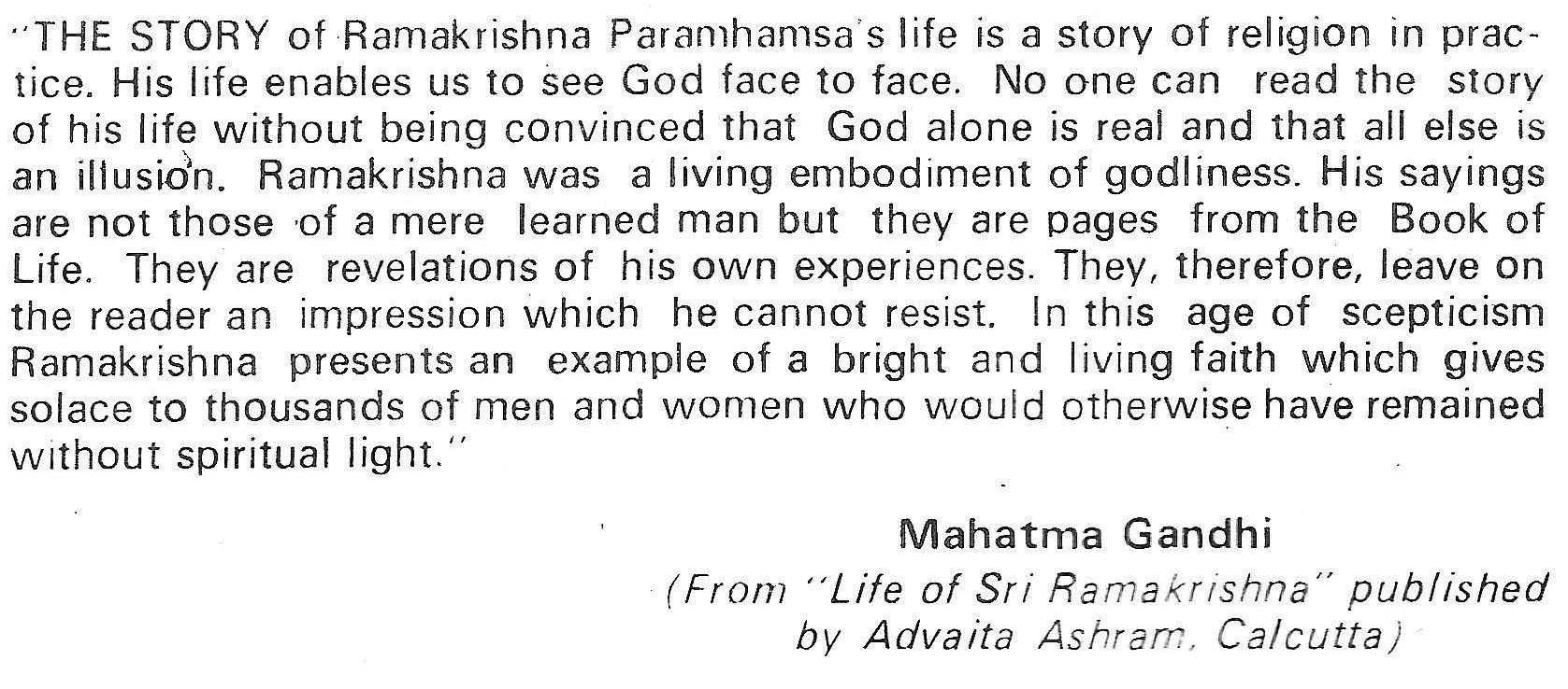"THE STORY of Ramakrishna Paramhamsa's life is a story of religion in prac- tice. His life enables us to see God face to face. No one can read the story of his life without being convinced that God alone is real and that all else is an illusion. Ramakrishna was a living embodiment of godliness. His sayings are not those of a mere learned man but they are pages from the Book of Life. They are revelations of his own experiences. They, therefore, leave on the reader an impression which he cannot resist. In this age of scepticism Ramakrishna presents an example of a bright and living faith which gives solace to thousands of men and women who would otherwise have remained without spiritual light."
